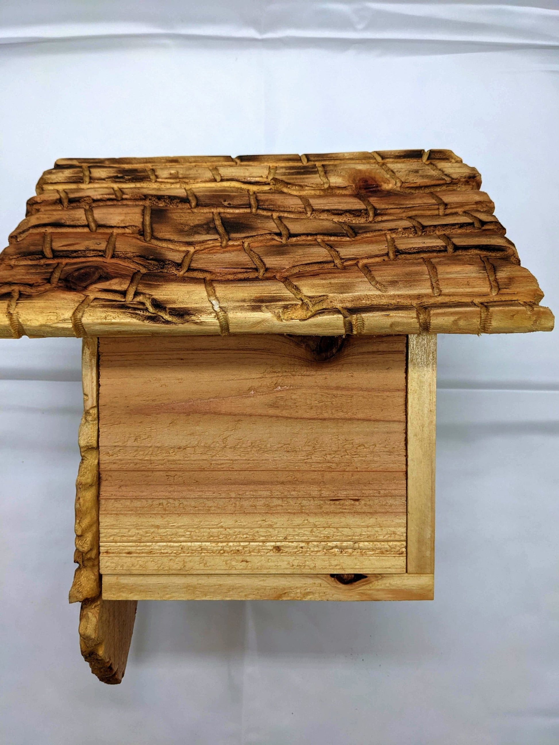 Hand carved cedar bird houses. Each one is unique and made by me, so your order may vary in appearance from the sample photos. However, every one of these has a smile for you! Made in Texas.